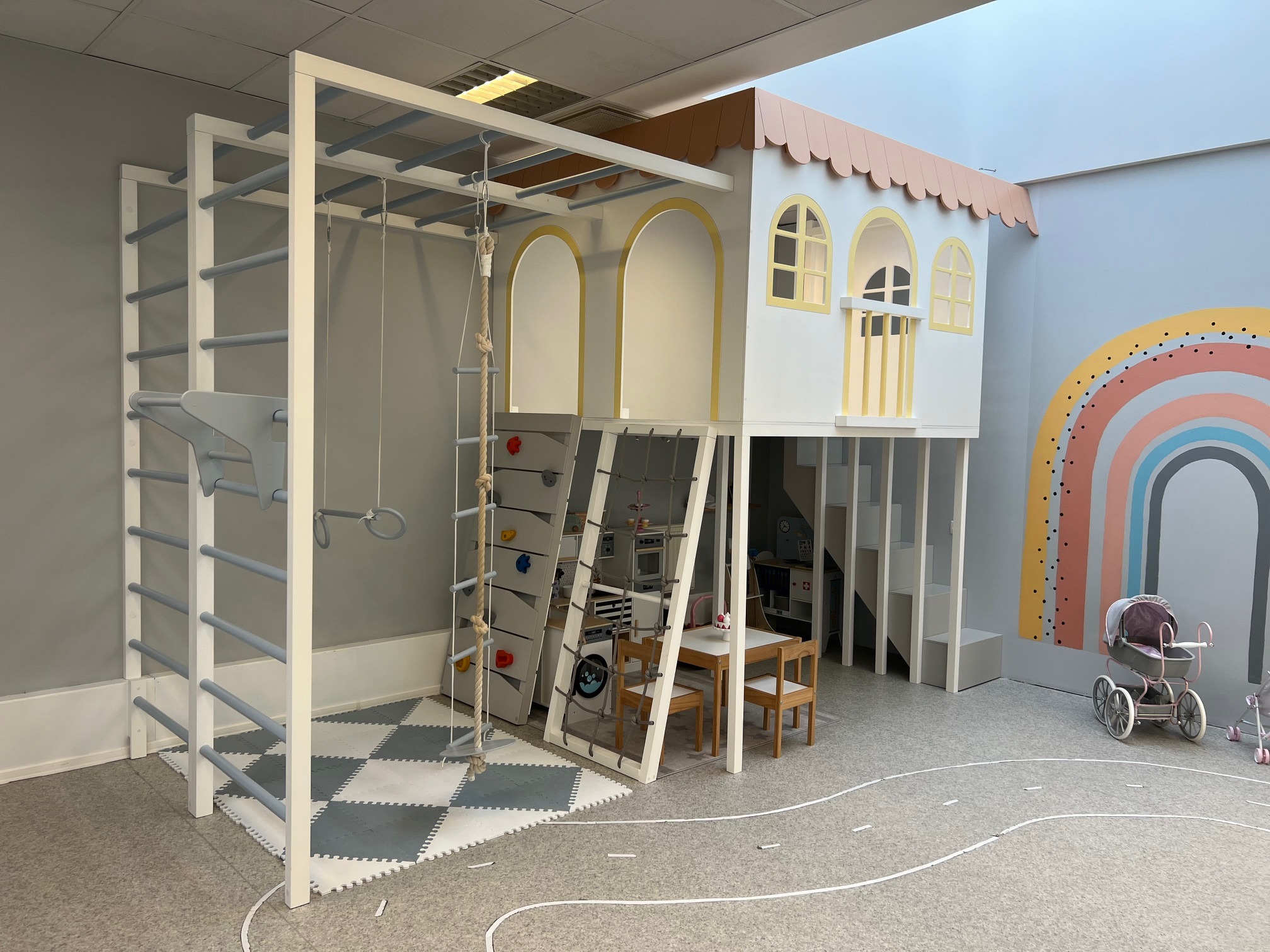 Mängutoa lastesõbralikud mänguasjad on valdavalt puidust. Mängida saab hubases majakeses, valmistades maitsvaid roogasid imearmsas köögis, ronida ronimisseinal kui ka liumäest laskuda värvilisse pallimerre. Peo külalised saavad külastada mängupoodi ja meisterdada töökojas. Samuti leiab siit imearmsa nukumaja, suure rongilaua, terve hulga autosid, vankreid-kärusid nukkudega ning palju muud põnevat. Mängutoa keskmeks on tore autorada koos liiklusmärkidega, et lapsed saaks juba varakult liiklemist õppida.